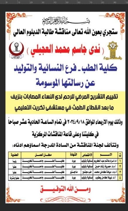 ( ندى جاسم محمد العجيلي ) بعنوان (تقييم التشريح المرضي للرحم لدى النساء المصابات بنزيف ما بعد انقطاع الطمث في مستشفى تكريت التعليمي ) في كلية الطب -جامعه تكريت الساعه الحاديه عشر صباحا من يوم الاربعاء المصادف 9/18 على قاعه المناقشات المركزية