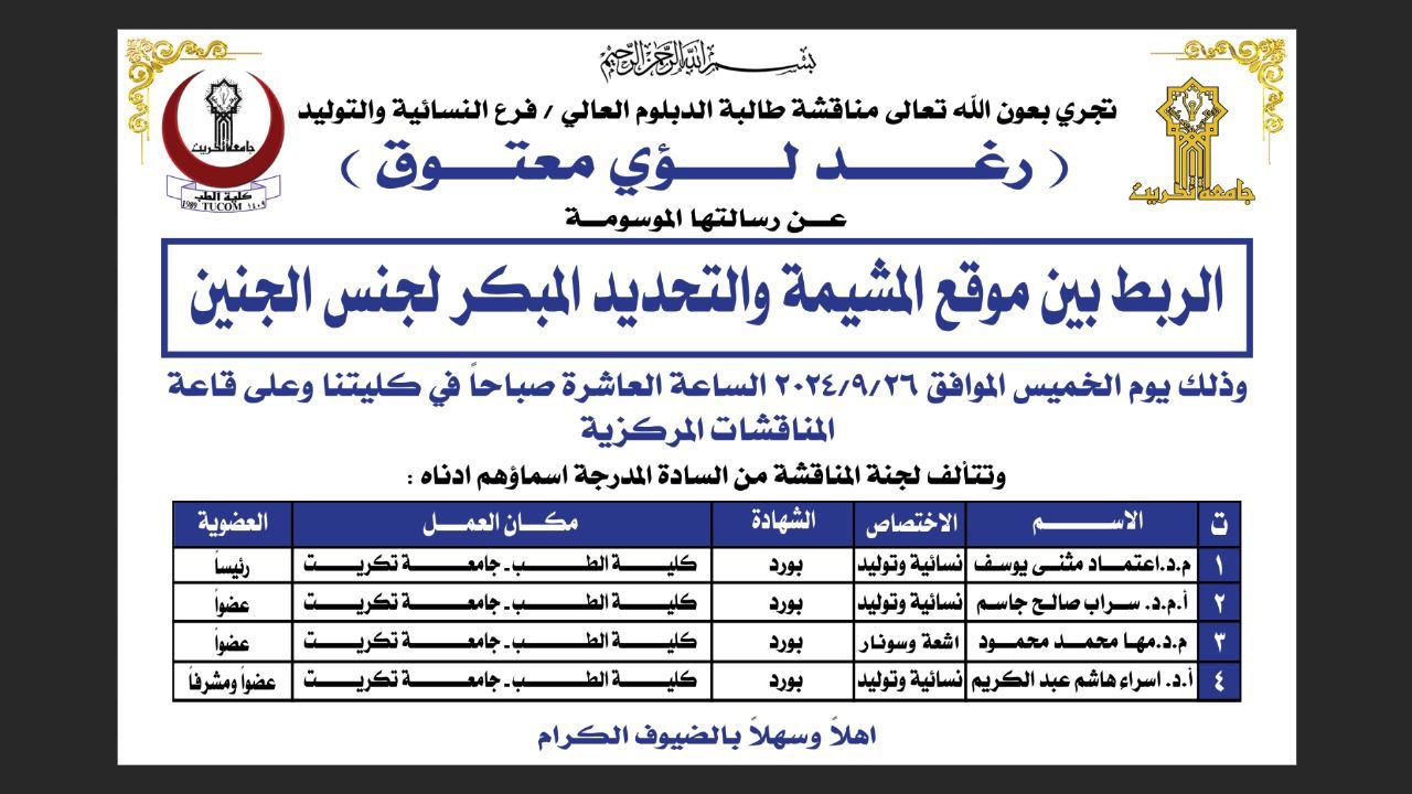 ستجري المناقشه العلنية لرسالة طالبة الدبلوم العالي رغد لؤي معتوق في كلية الطب بجامعة تكريت تحت عنوان (الربط بين موقع المشيمه والتحديد المبكر لجنس الجنين) على منصة قاعة المناقشات المركزيه يوم الخميس الموافق 2024/9/26