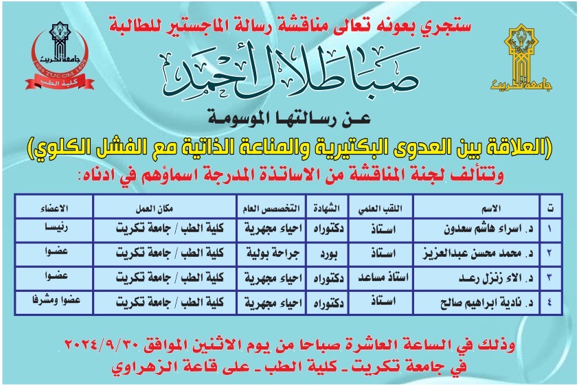 ستجري المناقشه العلنية لرسالة طالبة الماجستير صبا طلال احمد في كلية الطب بجامعة تكريت تحت عنوان ( العلاقة بين العدوى البكتيرية والمناعة الذاتية مع الفشل الكلوي ) على منصة قاعة الزهراوي يوم الاثنين الموافق 2024/9/30 في تمام الساعه العاشره صباحآ