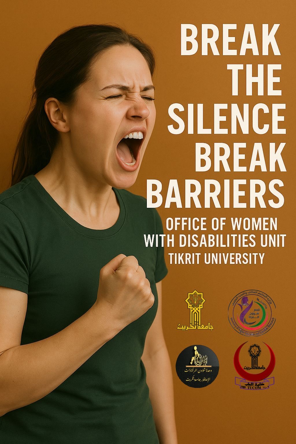 في إطار السعي لتعزيز الوعي والدعم المجتمعي لقضايا المرأة، أطلقت جامعة تكريت الحملة التوعوية الكبرى والشاملة تحت شعار *“كسر الصمت، كسر الحواجز”*، وذلك داخل الحرم الجامعي للفترة من *20 أيار إلى 5 حزيران 2025*. تهدف الحملة إلى تسليط الضوء على التحديات التي تواجهها النساء، لا سيما ذوات الإعاقة وتعزيز ثقافة الدعم والمناصرة لحقوقهن من خلال فعاليات متعددة تشمل ورش عمل، ندوات، معارض توعوية، ولقاءات حوارية مفتوحة وتُقام الحملة بتنظيم *مشترك بين وحدة شؤون المرأة ذات الإعاقة – جامعة تكريت، وكلية الطب وبدعم وتنسيق مع مختلف الجهات الأكاديمية والإدارية في الجامعة. وتأتي هذه المبادرة لترسيخ مفاهيم *العدالة، التمكين، والمساواة* داخل البيئة الجامعية، والمساهمة الفاعلة في *كسر حواجز التهميش والصمت تجاه قضايا المرأة*، وبخاصة النساء من الفئات الهشة والمهمّشة.