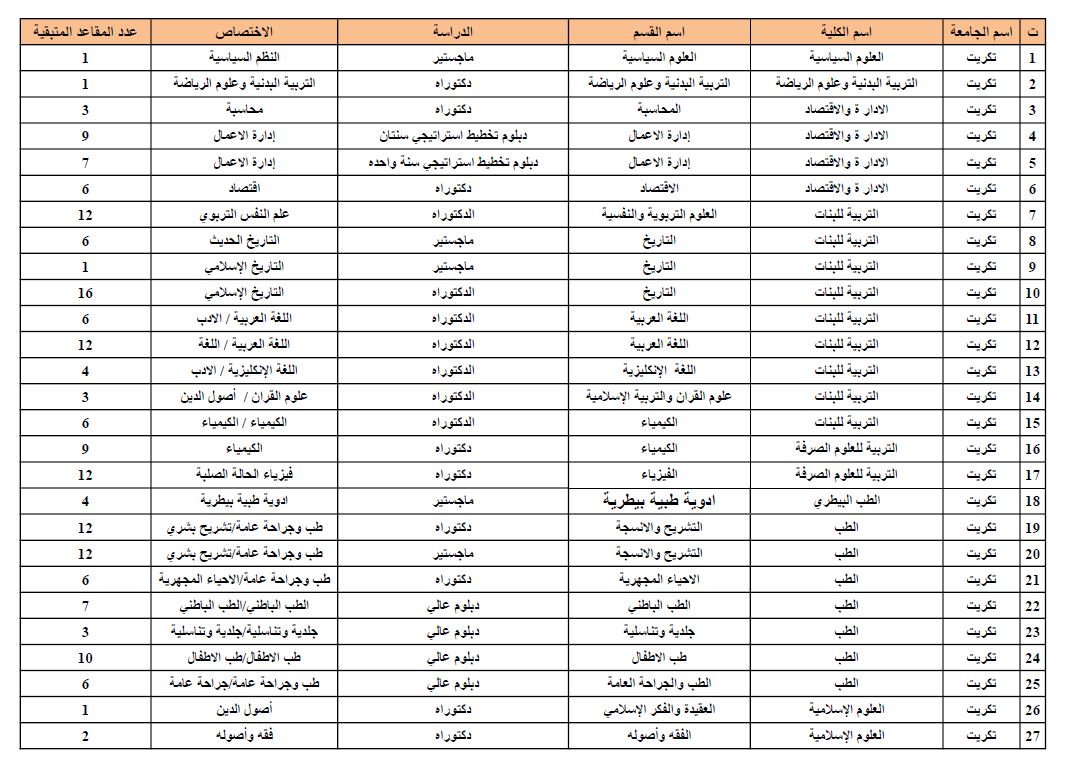 حسب توجيهات السيد رئيس جامعة تكريت الأستاذ الدكتور ( وعد محمود رؤوف ) وتوجيهات السيد مساعد رئيس الجامعة للشؤون العلمية الأستاذ الدكتور ( حسن حسين إبراهيم ) وبمتابعة وإشراف السيد مدير قسم شؤون الدراسات العليا الأستاذ الدكتور ( مثنى احمد وكاع ) وبالإشارة الى كتاب وزارة التعليم العالي والبحث العلمي/دائرة البحث والتطوير/قسم الدراسات العليا ذي العدد ب ت5/8889 في 12/9/2024، جامعة تكريت تعلن عن المقاعد الشاغرة في الملف المرفق أدناه.
