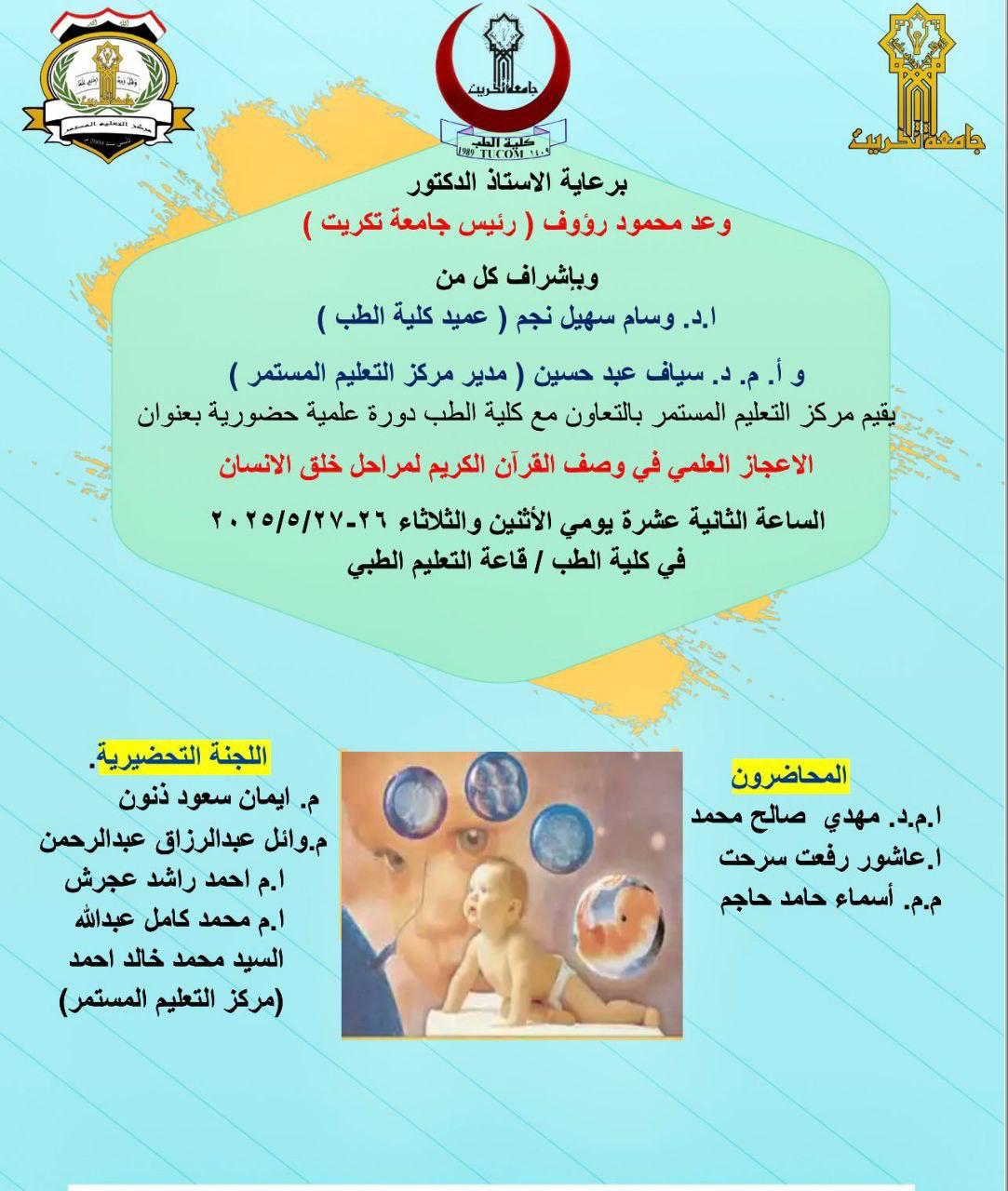 اعلان دورة علمية حضورية بعنوان (الاعجاز العلمي في وصف القران الكريم لمراحل خلق الانسان)