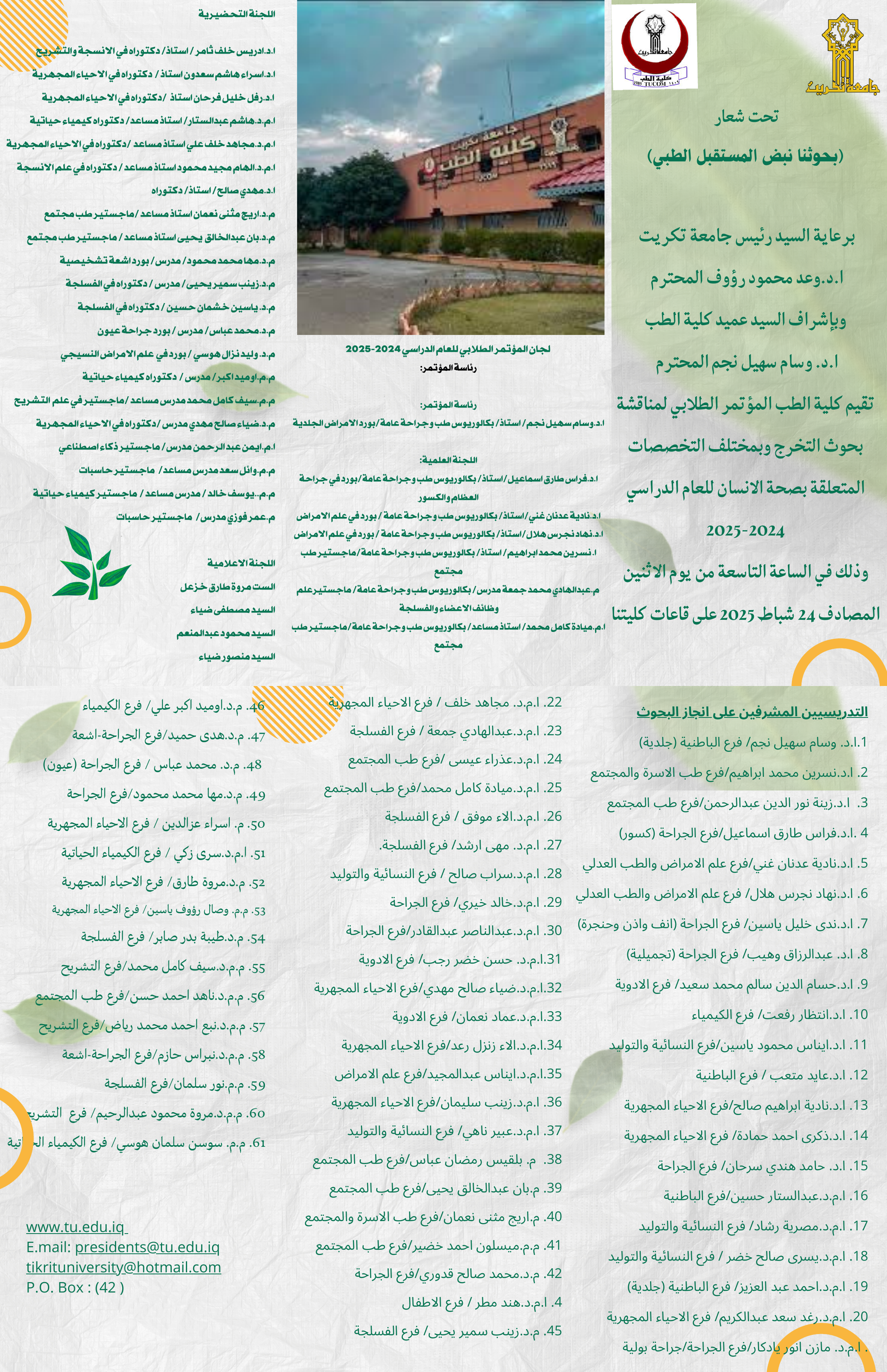 تحت شعار “بحوثنا نبض المستقبل الطبي”، وبرعاية السيد رئيس جامعة تكريت الأستاذ الدكتور وعد محمود رؤوف المحترم، وبإشراف السيد عميد كلية الطب الأستاذ الدكتور وسام سهيل نجم المحترم، تقيم كلية الطب المؤتمر الطلابي لمناقشة بحوث التخرج للعام الدراسي 2024-2025.