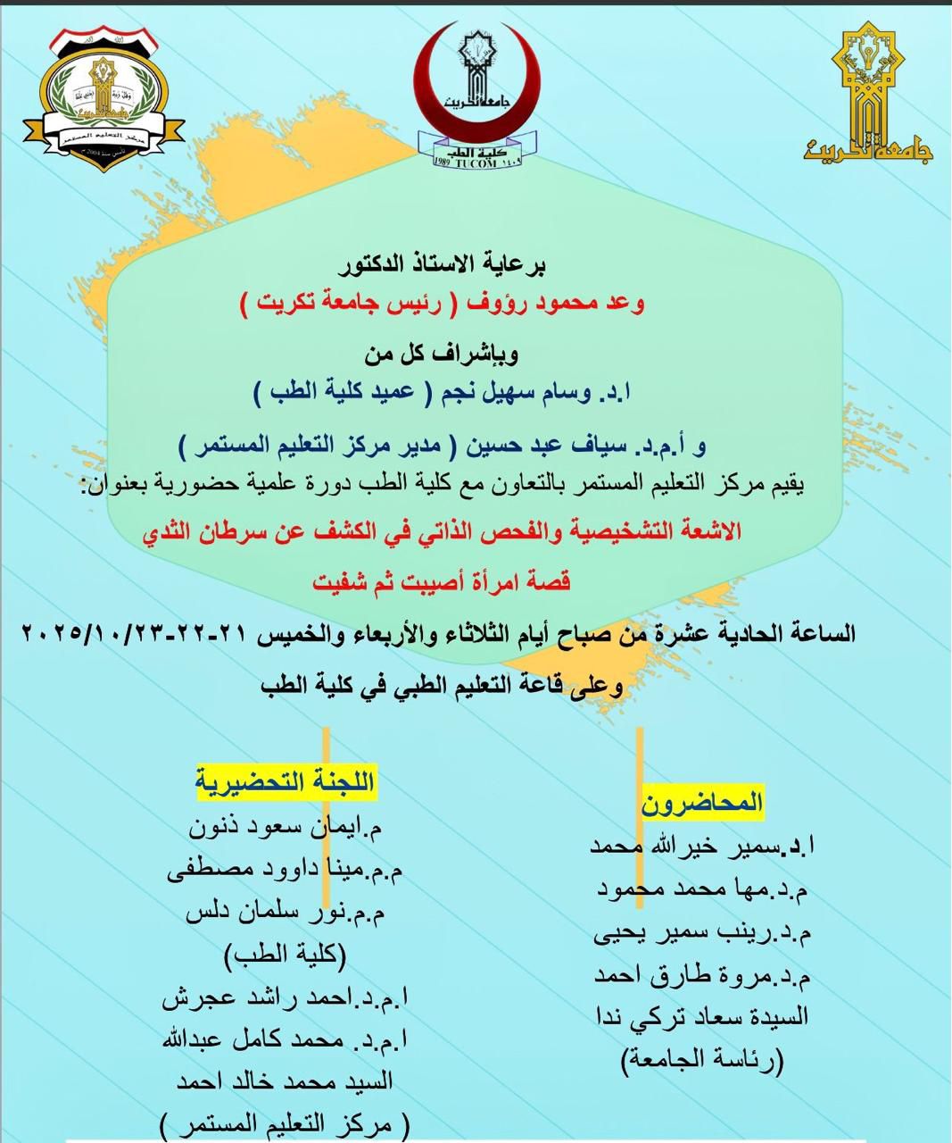 دورة علمي حضورية بعنوان (الاشعة التشخيصية والفحص الذاتي في الكشف عن سرطان الثدي قصة امراة اصيبت ثم شفيت)
