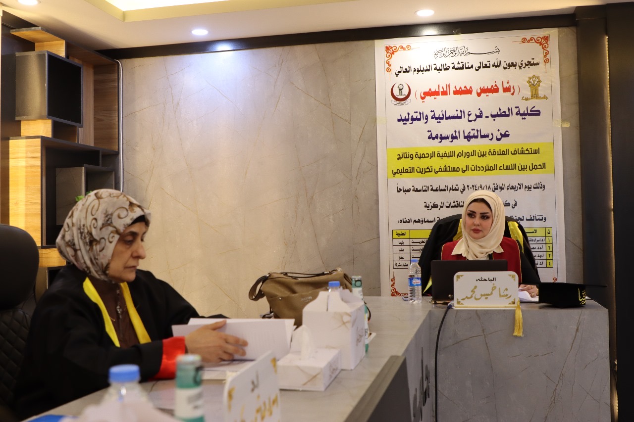 تم مناقشة رسالة الدبلوم العالي في كلية الطب بجامعة تكريت تحت عنوان (استكشاف العلاقة بين الاورام الليفية الرحمية ونتائج الحمل بين النساء المترددات الى مستشفى تكريت التعليمي) للطالبة (رشا خميس محمد الدليمي) على منصة قاعة المناقشات المركزية يوم الاربعاء الموافق ٩/١٨ اظهرت هذه الدراسة الحالية بالورم العضلي الأملس الرحمي هو أحد الأورام الحميدة الأكثر شيو ًعا في الجهاز التناسلي