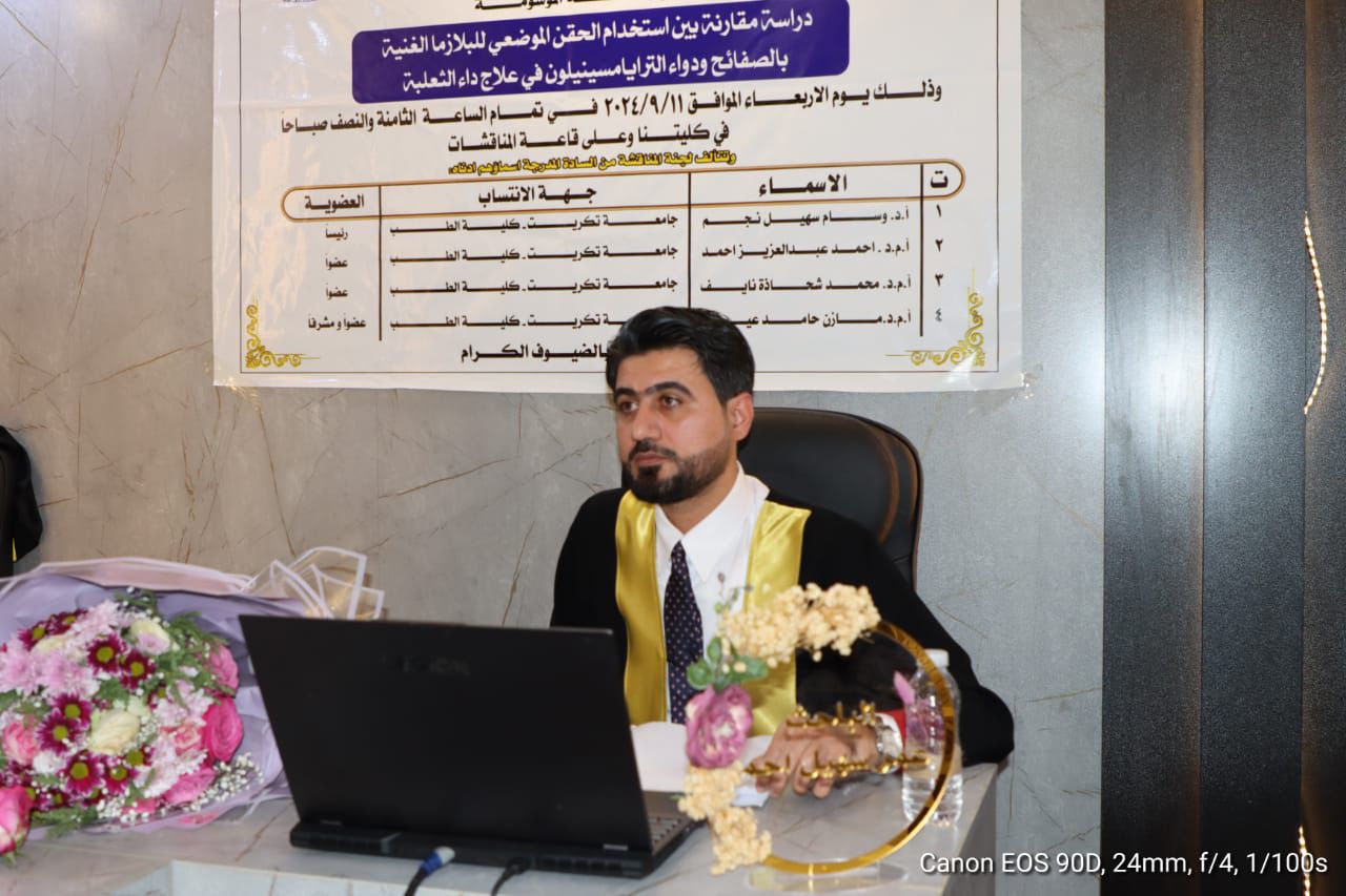عن رسالته الموسومة ( دراسة مقارنة بين استخدام الحقن الموضعي للبلازما الغنية بالصفائح ودواء الترايامسينيلون في علاج الثعلبة )