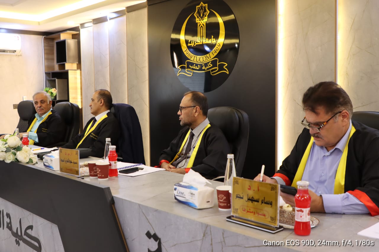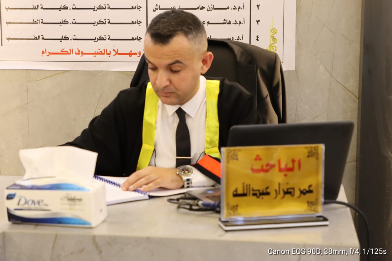 جرت على منصة قاعة المناقشات المركزية في كلية الطب مناقشة رسالة الدبلوم العالي للطالب عمر ضرار عبدالله فرع الطب الباطني- شعبة الجلدية عن رسالته الموسومة ( تقيم تركيز الزنك في مصل الدم لدى مرضى التهاب الجلد التحسسي- دراسة مقارنة)
