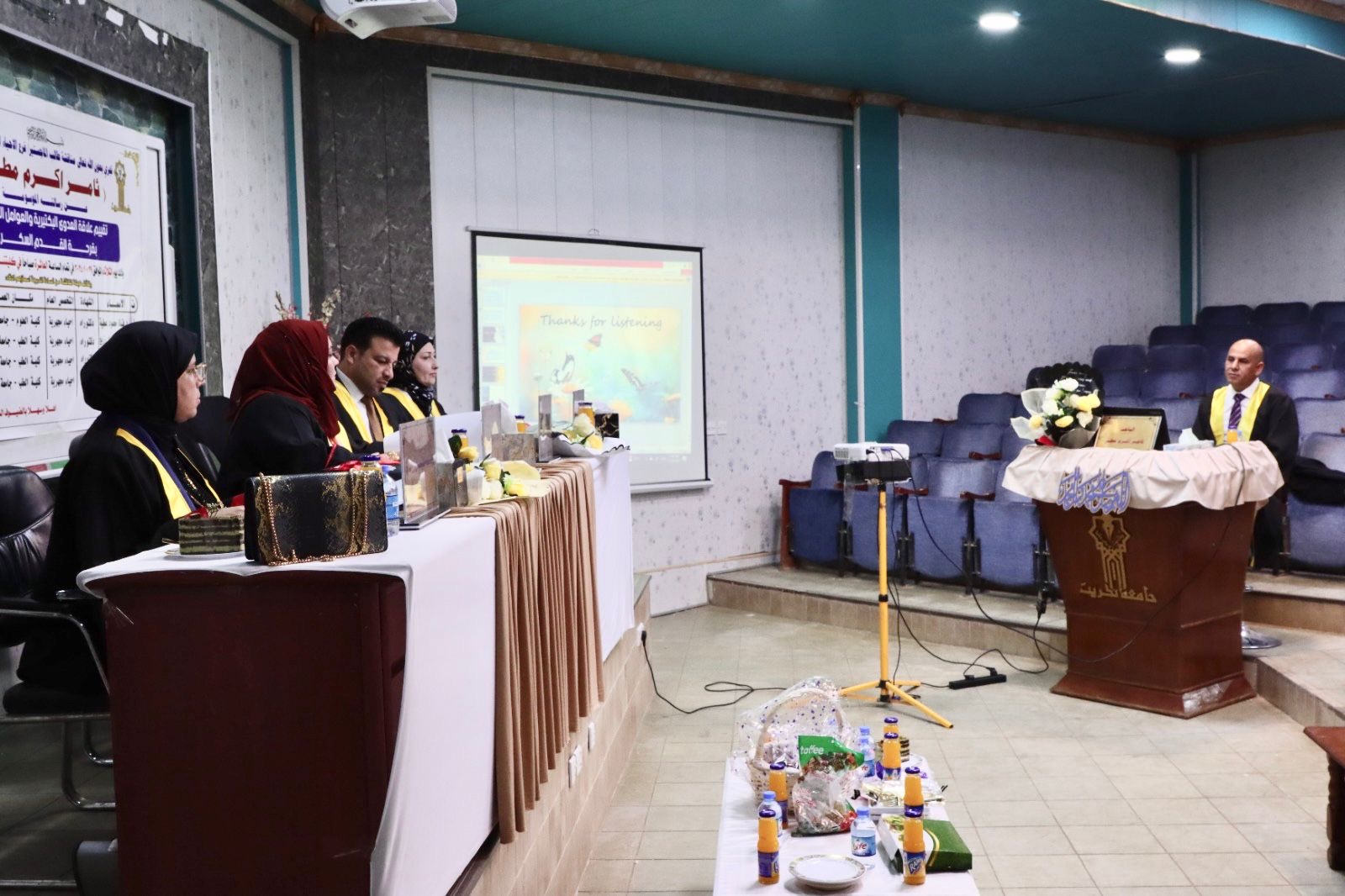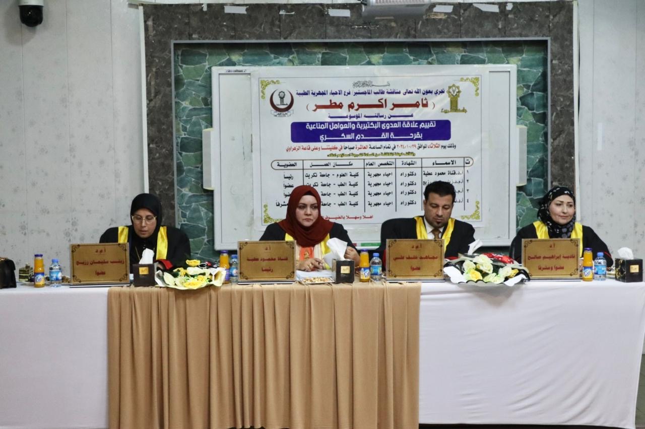 جرت على منصه قاعة الزهراوي في كلية الطب مناقشة رسالة الماجستير - فرع الاحياء المجهرية للطالب ثامر اكرم مطر عن رسالته الموسومة (تقيم علاقة العدوى البكتيرية والعوامل المناعية بقرحة القدم السكري )
