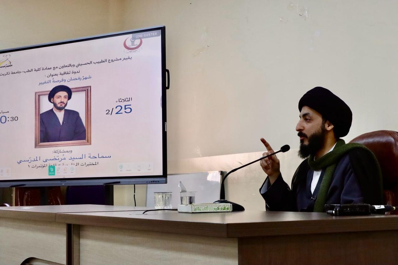 نظّمت كلية الطب بجامعة تكريت، بالتعاون مع مركز التعليم المستمر، ندوة توعوية حملت عنوان “شهر رمضان وفرصة التغيير”، وذلك في إطار جهودها لتعزيز الوعي الديني والاجتماعي بين الطلبة وأعضاء الهيئة التدريسية استضافت الندوة المحاضر السيد مرتضى المدرسي من حوزة الإمام المنتظر في كربلاء المقدسة، حيث تناول في كلمته فضائل شهر رمضان المبارك، مشيرًا إلى أنه شهر الصيام والقيام، شهر الغفران والرحمة، شهر تُفتح فيه أبواب الجنة وتُضاعف فيه الحسنات، ويعد فرصة عظيمة للتوبة والتغيير نحو الأفضل. كما أكد على أهمية استقبال الشهر الكريم بالعزيمة الصادقة على الصيام والقيام، والمبادرة إلى الأعمال الصالحة، والتعاون على البر والتقوى وشهدت الندوة حضور عميد الكلية ومعاونيه، إلى جانب نخبة من الأساتذة والمنتسبين والطلبة، الذين تفاعلوا مع النقاشات والمقترحات المطروحة، مؤكدين أهمية مثل هذه الفعاليات في تعزيز القيم الإيمانية والاجتماعية.
