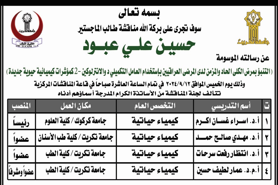 ستجرى المناقشة العلنية لرسالة طالب الماجستير ( حسين علي عبود )بعنوان (التنبؤ بمرض الكلى الحاد و المزمن لدى المرضى العراقيين باستخدام العامل التكميلي د و الانترلوكين-2 كمؤشرات كيميائية و حيوية جديدة )في كلية الطب -جامعه تكريت الساعه العاشرة صباحا من يوم الخميس المصادف 9/12على قاعه المناقشات المركزية