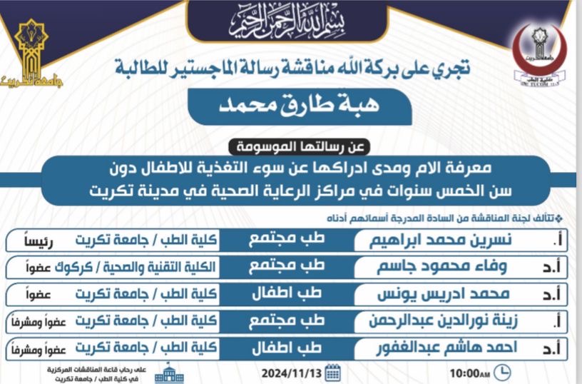 ستجرى المناقشه العلنية لطالبة الماجستير (هبه طارق محمد) بعنوان (معرفة الأم ومدى أدراكها عن سوء التغذيه للأطفال دون سن الخمس سنوات في المراكز الصحيه الاولية في مدينة تكريت) في كلية الطب-جامعة تكريت الساعه العاشره صباحاً يوم الأربعاء المصادف 2024/11/13 على رحاب قاعة المناقشات المركزية.