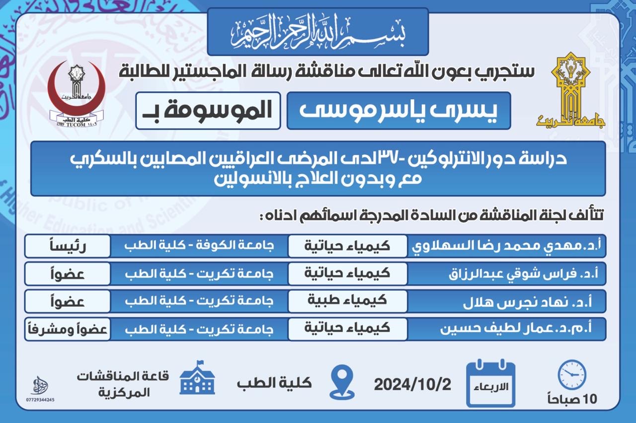 مناقشة علمية ستجري المناقشة العلنية لرسالة الماجستير للطالبة ( يسرى ياسر موسى ) بعنوان ( دراسة دور الأنترلوكين-1بيتا و الأنترلوكين-37 لدى المرضى العراقيين المصابين بالسكري مع و بدون العلاج بالأنسولين )في كلية الطب -جامعة تكريت الساعة العاشرة صباحا يوم الأحد المصادف ٢/١٠ على قاعة المناقشات المركزية .