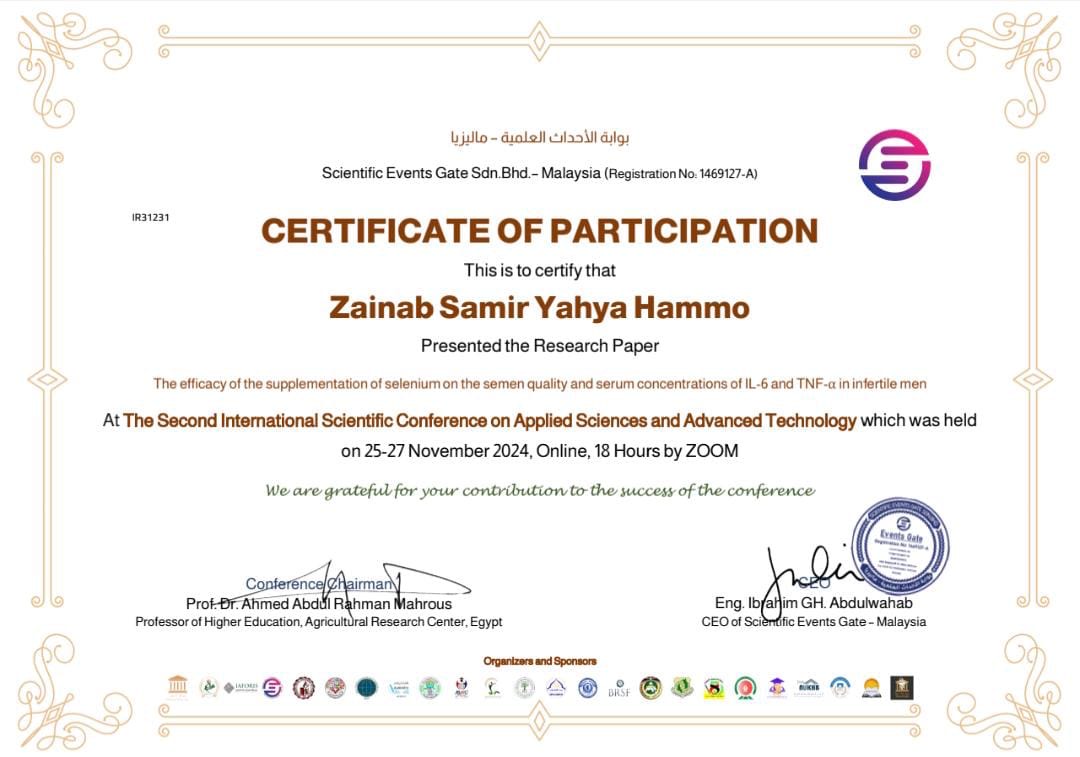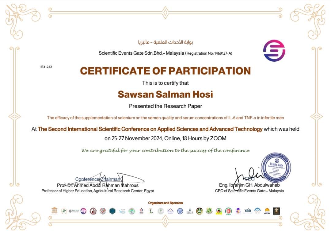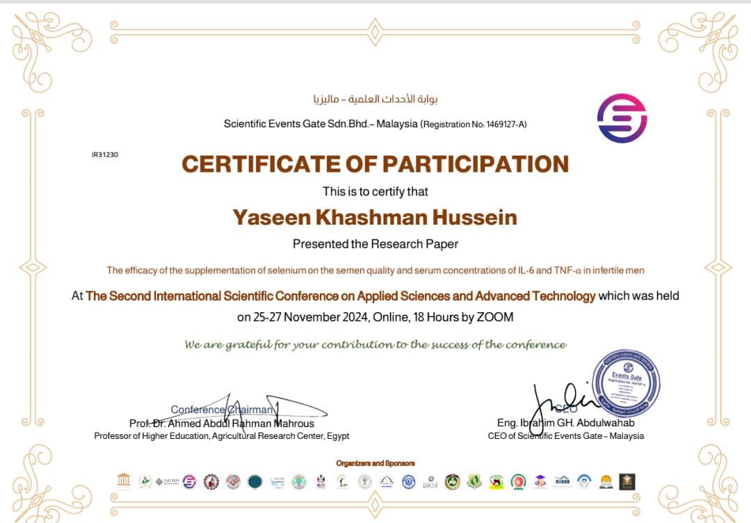 شارك كل من م.د.ياسين خشمان حسين و م.د.زينب سمير يحيى و م.م.سوسن سلمان هوسي في المؤتمر العلمي الدولي الثاني للعلوم التطبيقية والتكنولوجيا المتقدمة