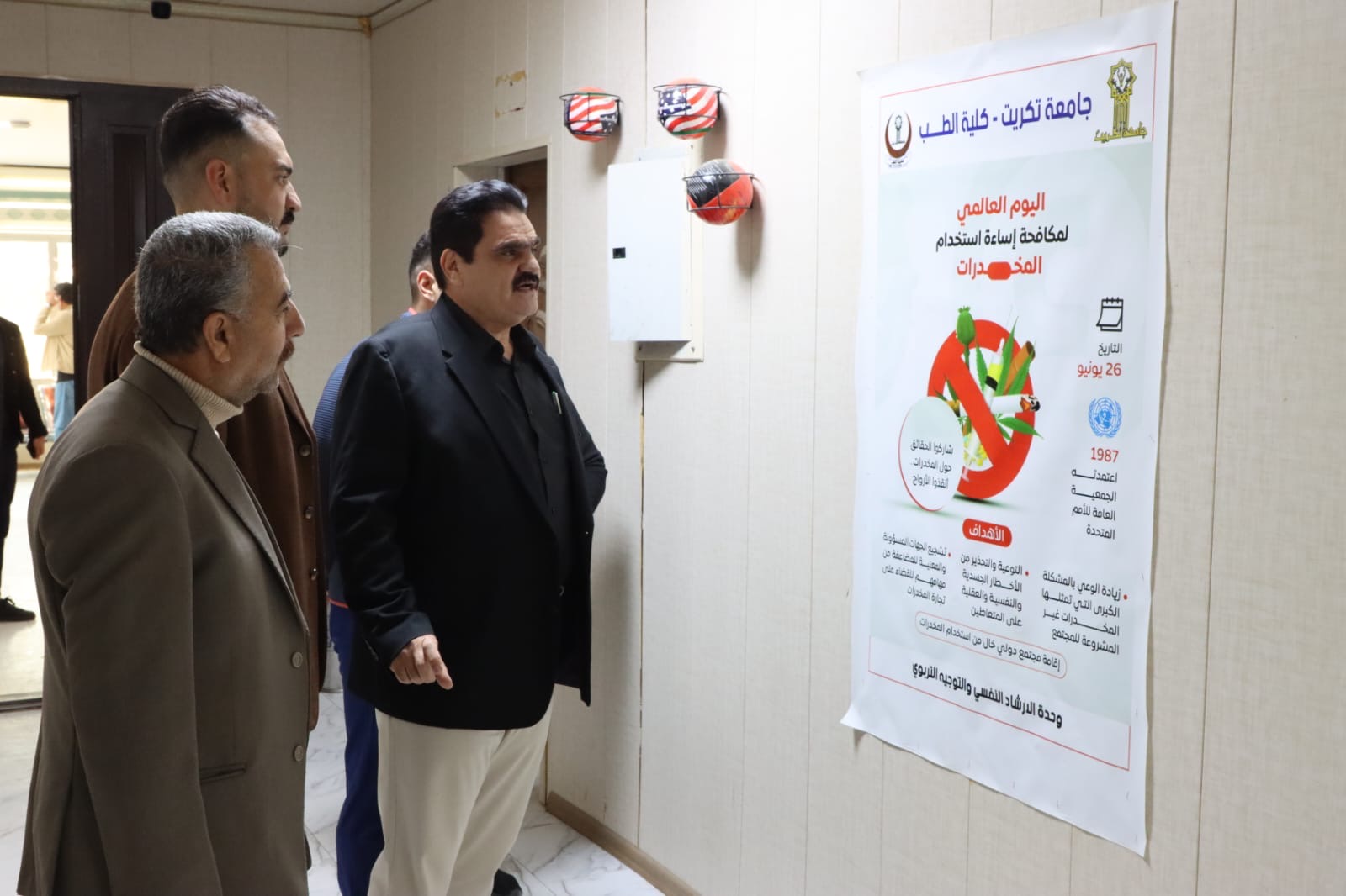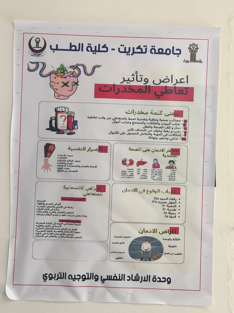 باشراف مباشر من قبل السيد عميد كلية الطب جامعة تكريت الاستاذ الدكتور وسام سهيل نجم باشرت وحدة الارشاد النفسي والتوجيه التربوي بنشر بوسترات توعوية عن مخاطر المخدرات وآثارها وتأتي هذه الخطوة ضمن سلسلة من النشاطات التي تقوم بها الوحدة بهدف التوعية من مخاطر الإدمان.