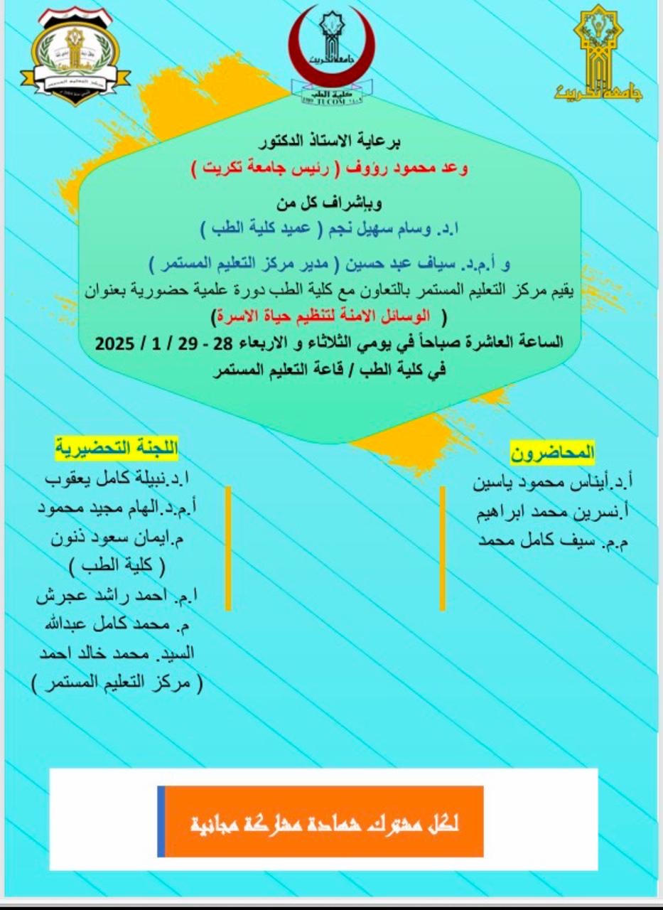 اعلان دورة علمية حضورية (الوسائل الامنة لتنظيم حياة الاسرة)