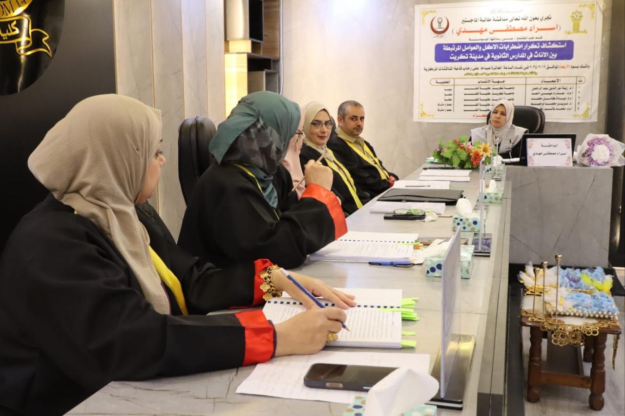 شهدت القاعة المركزية للمناقشات في كلية الطب بجامعة تكريت مناقشة رسالة الماجستير للطالبة إسراء مصطفى مهدي من فرع طب المجتمع، والتي حملت عنوان:“استكشاف تكرار اضطرابات الأكل والعوامل المرتبطة بين الإناث في المدارس الثانوية في مدينة تكريت”.