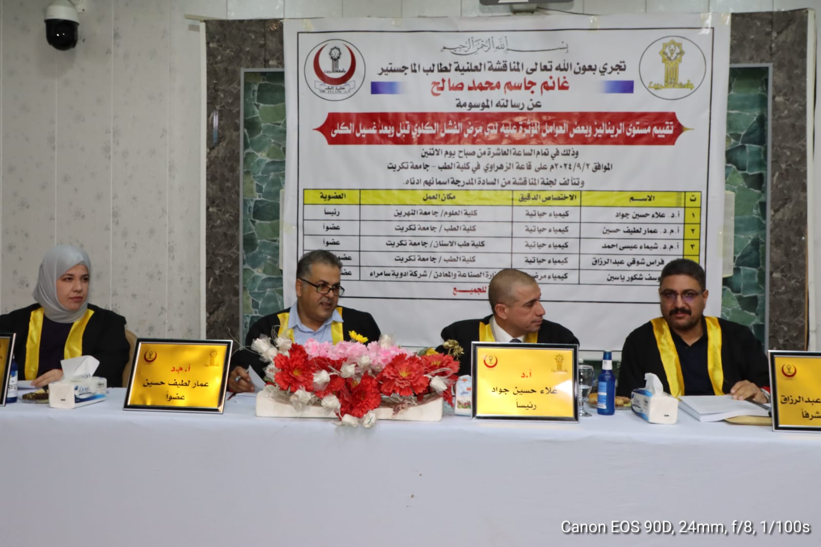 نوقشت رساله ماجستير في كليه الطب _ جامعة تكريت بعنوان (تقييم مستوى الريناليز وبعض العوامل المؤثرة عليه لدى مرضى الفشل الكلوي قبل وبعد غسيل الكلية) لطالب الماجستير ( غانم جاسم محمد) على منصة قاعة الزهراوي يوم الاثنين الموافق ٢٠٢٤/٩/٢ في هذه الدراسة، تم فحص مستويات ريناليز، والكاتيكولامينات (الإبينفرين، والنورإبينفرين، والدوبامين)، والكيموتربسين، واليوريا، والكرياتينين، والفوسفاتيز القلوي ، وناقلة أمين الألانين ،وناقلة أمين الأسبارتات لدى مرضى الفشل الكلوي المزمن قبل وبعد غسيل الكلى. تم اختيار سبعين مريضا من مرضى الفشل الكلوي المزمن وأربعين شخصا عاديا كمجموعة ضابطة . تم فحص مستويات الريناليز والكاتيكولامين والكيموتربسين بواسطة تقنية ELISA. كان مستوى الريناليز في مرضى الفشل الكلوي المزمن أقل بشكل ملحوظ عند مقارنته مع مجموعة الضابطة ، و زادت مستويات ريناليز بشكل ملحوظ بعد غسيل الكلى ، فيما يتعلق بالطبيعة الدقيقة للعلاقة بين الريناليز و(الجنس والعمر ومؤشر كتلة الجسم) لا يزال مجالا للبحث النشط. كما زادت مستويات الكاتيكولامينات (الإيبنفرين والنورإبينفرين والدوبامين) بشكل ملحوظ قبل و بعد غسيل الكلى لدى مرضى الفشل الكلوي المزمن بالمقارنة مع مجموعة الضابطة . لا توجد علاقة معنوية بين الكاتيكولامينات و(الجنس والعمر ومؤشر كتلة الجسم). كما يرتفع مستوى الكيموتريبسين في المرضى الفشل الكلوي المزمن. لا توجد علاقة معنوية بين الكيموتربسين و(الجنس والعمر ومؤشر كتلة الجسم). وللمرض تأثير على مستوى الريناليز حيث تسبب في انخفاض كبير في مستواه قبل عملية الغسيل الكلوي. المستوى العالي من ريناليز بعد غسيل الكلى سوف يقلل من كل من الكاتيكولامينات والكيموتربسين . تجدر الأشارة الى ان لجنة المناقشة تألفت من الاساتذه الافاضل :