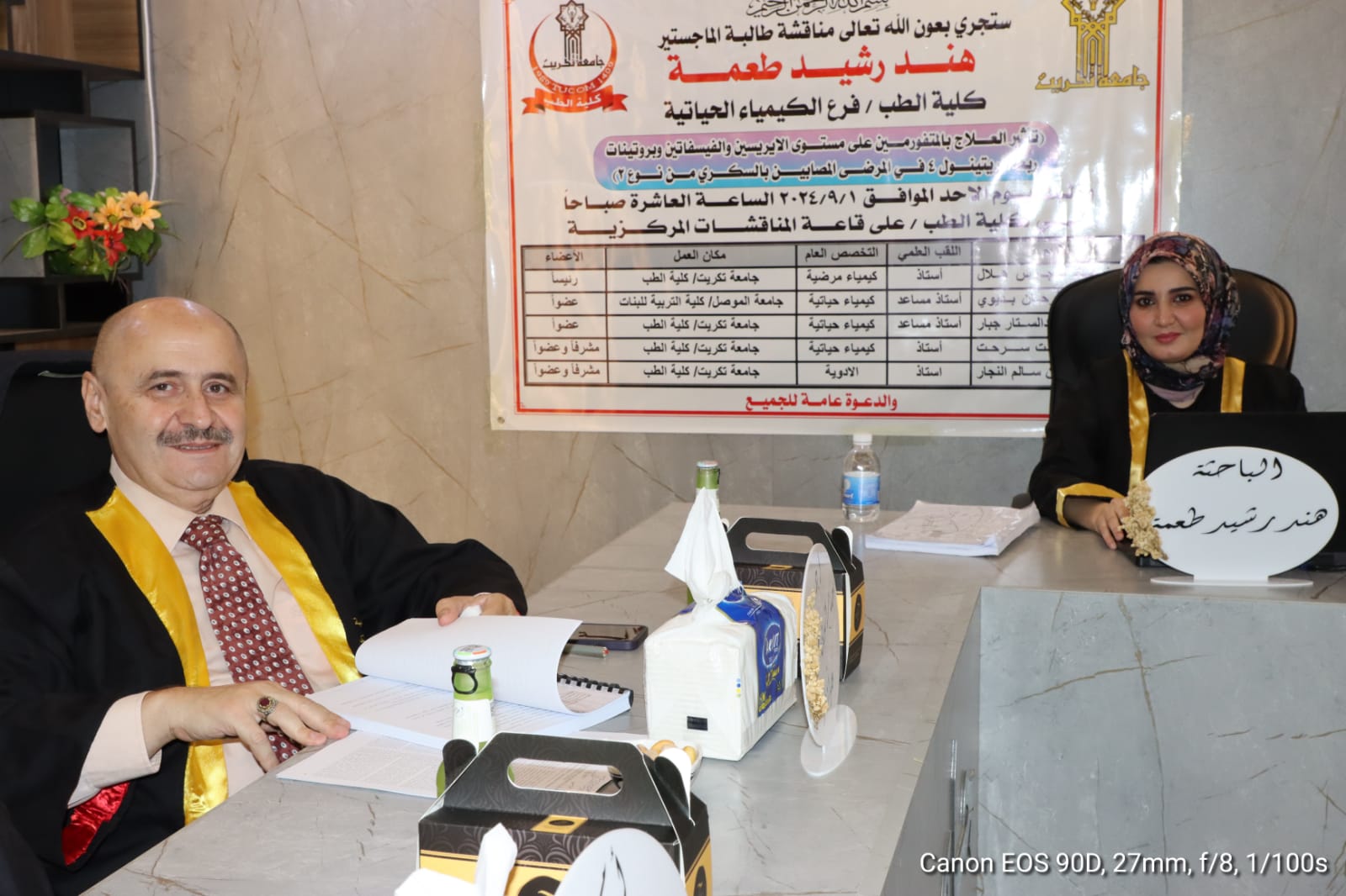 نوقشت رساله ماجستير في كليه الطب _ جامعة تكريت بعنوان( تأثير العلاج بالميتفورمين على مستوى الأيريسين والفيسفاتين وبروتينات ربط الريتنول ٤ في المرضى المصابين بالسكري من النوع ٢ ) لطالبة الماجستير ( هند رشيد طعمة ) على منصة قاعة المناقشات المركزية يوم الأحد الموافق ٢٠٢٤/٩/١ وأضهرت نتائج الدراسة مايلي :