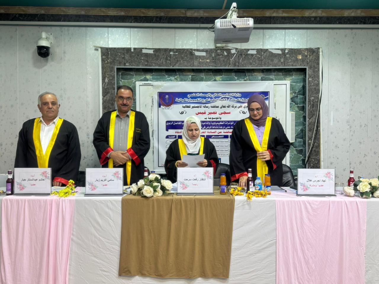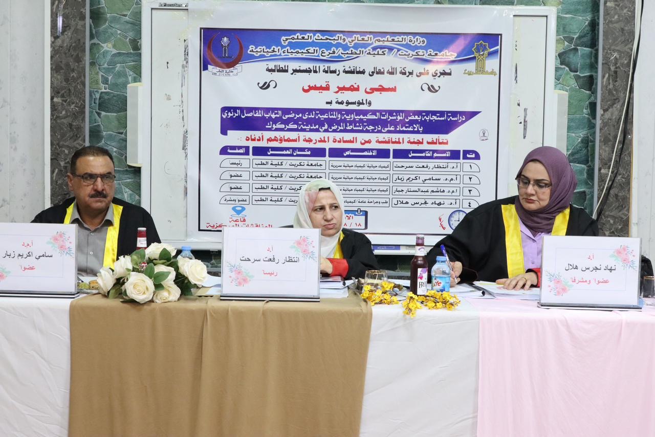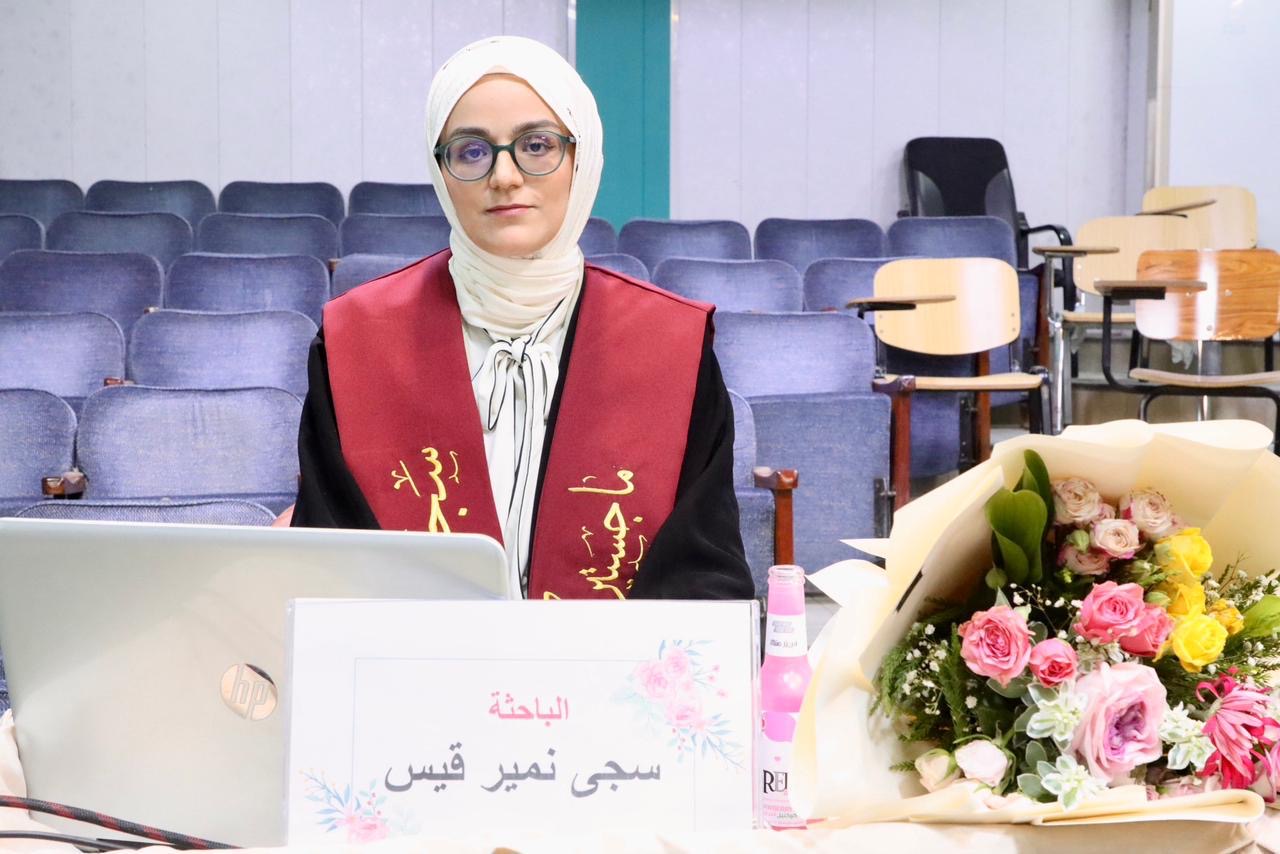 جرت بعون الله تعالى مناقشة رسالة الماجستير للطالبة سجى نمير قيس في فرع الكيمياء الحياتية، والموسومة:
