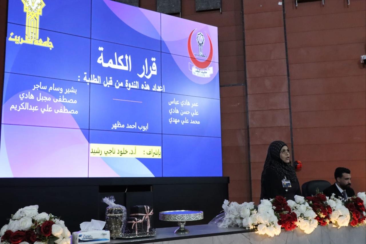 برعاية الأستاذ الدكتور وعد محمود رؤوف، رئيس جامعة تكريت، وبإشراف كل من أ.د. وسام سهيل نجم، عميد كلية الطب، وأ.م.د. سيف عبد حسين، مدير مركز التعليم المستمر، نظّم مركز التعليم المستمر بالتعاون مع كلية الطب ندوة علمية حضورية بعنوان “قرار الكلمة”.